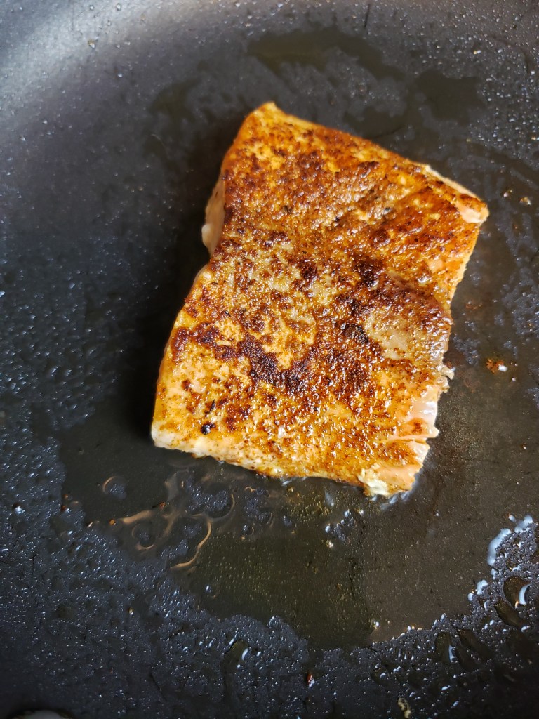 4. Sear salmon on both sides. Cook under medium heat until cooked to an internal temperature of 145 degrees Fahrenheit.